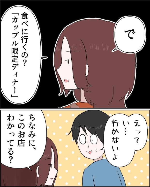 その後、「で、食べに行くの?『カップル限定ディナー』」私がそう聞くと、「えっ?い・・行かないよ」と動揺する謙介。私は気づいていなさそうな彼に「ちなみに、このお店わかってる?」と切り出しました。