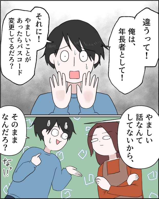 すると、「違うって!俺は、年長者として!それに!やましいことがあったらパスコード変更してるだろ?やましい話なんてしてないから、そのままなんだろ?なっ!!」必死に取り繕おうとして次々話し出す謙介をじっと見た後、