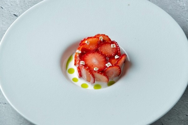 コースを締めくくるのは「苺とバラのパフェ」。バラのブランマンジェとローストしたビーツを重ね、苺の甘酸っぱさに寄り添う優雅な香りが広がる仕上がりとなっている。