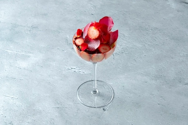 今回のコースには、お茶菓子とデザートに合わせた3杯のモクテル(ノンアルコールカクテル)と食後の飲み物が含まれており、この日だけのペアリング体験が可能だ。また、追加料金で苺と相性の良いアルコールも用意される。