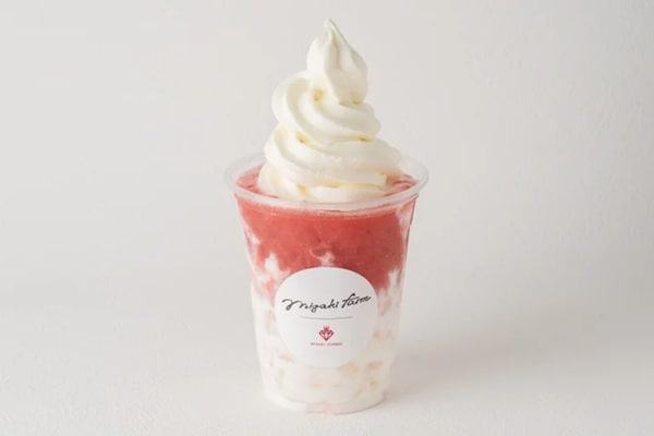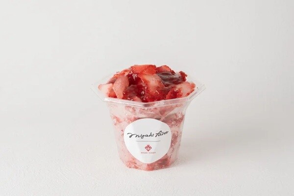 「まるごとけずりいちご」は、凍らせた完熟「ミガキイチゴ」をそのまま削った、ふわふわ食感のデザート。