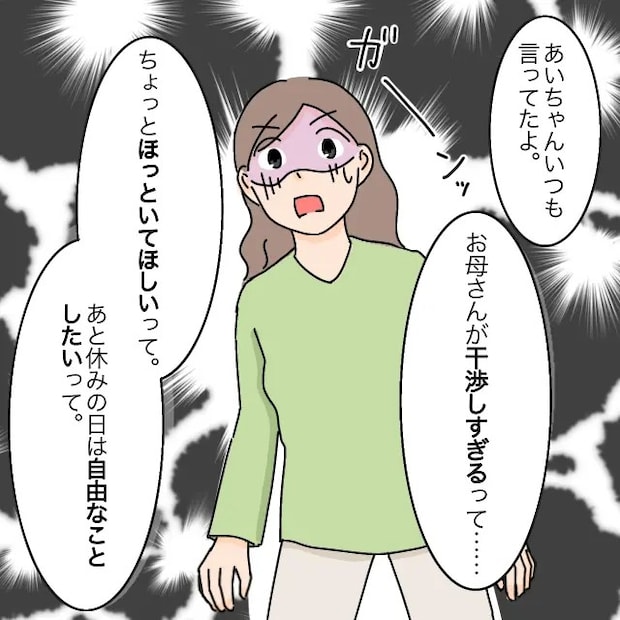 まりあちゃんは「あいちゃんもいつも言ってたよ。お母さんが干渉しすぎるって・・。ちょっとほっといてほしいって。あと休みの日は自由なことしたいって」と淡々と言いました。とてもショックでした。まさかあいがそんな風に思っていたなんて・・。