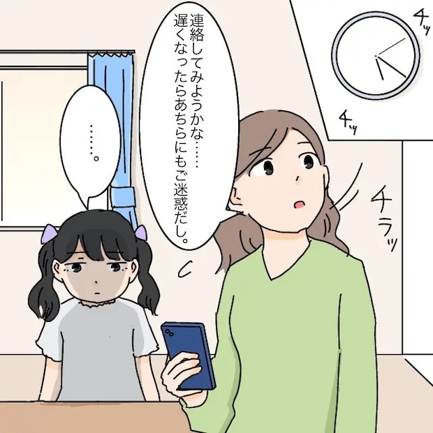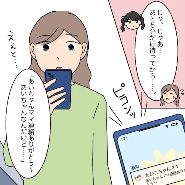 悩んだ挙句、「じゃ、じゃあ・・あと5分だけ待ってから・・」となんとか落としどころを見つけたその時、たかこちゃんママから返信が届きました。今から家を出るという連絡かな?それとももうすぐ着くという連絡かな?そう思いながら、私は届いたメッセージを読み上げました。『あいちゃんママ連絡ありがとう~。あいちゃんなんだけど・・』なんにせよ、たかこちゃんのお母さんと連絡がついて一安心です。
