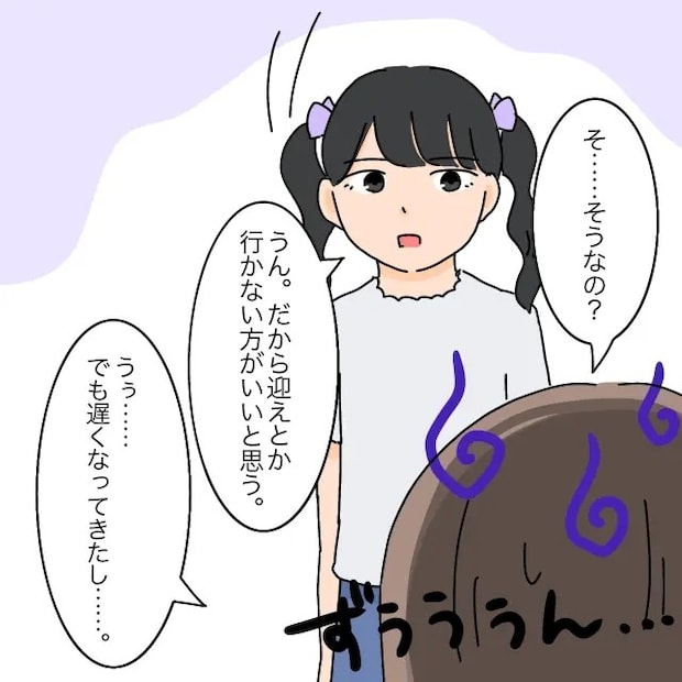 かなり落ち込みながらも、まりあちゃんの前なので「そ・・そうなの?」と平静を装う私。「うん。だから迎えとか行かない方がいいと思う」まりあちゃんにそう言われ、「うぅ・・、でも遅くなってきたし・・」と葛藤しました。あいに鬱陶しがられるのも嫌だけど、やはり心配です。