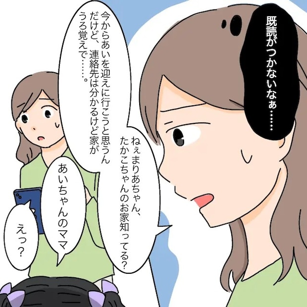 しかし、たかこちゃんママにメッセージを送ったものの、なかなか既読がつきません。気が気でない私は「ねぇまりあちゃん、たかこちゃんのお家知ってる?今からあいを迎えに行こうと思うんだけど、連絡先は分かるけど家がうろ覚えで・・」とまりあちゃんに声をかけました。すると、まりあちゃんが「あいちゃんのママ・・」と意を決したように口を開いたので「えっ?」と聞き返すと、