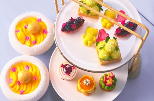 「ブラックフォレスト」、「はちみつとアプリコットムース」、「国産マンゴーのカルパッチョ ウーロン茶とパッションフルーツシャーベット」、「フレッシュブルーベリーチーズケーキ」など、フレッシュブルーベリー、アプリコット、マンゴーなどの春の余韻と初夏の息吹を感じるフルーツを贅沢に用い、ムース、タルト、フルーツカルパッチョなど多彩な味わいで提供。