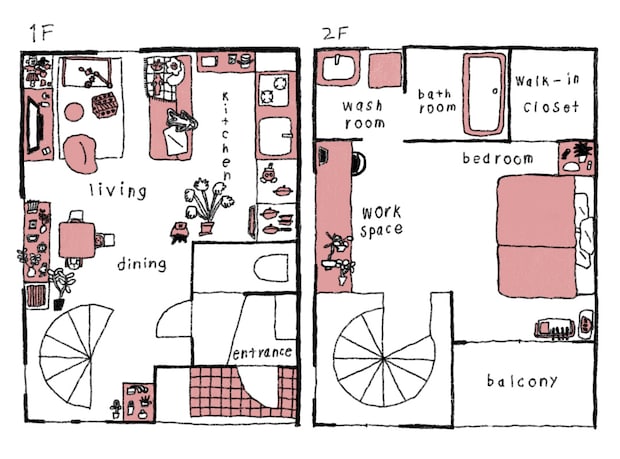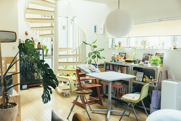 可愛い螺旋階段と大きな窓からたっぷりと降り注ぐ自然光。それが、この家に住もうと決めた理由だった。光をたっぷり受けて育つ約100鉢のグリーンと、部屋中に飾られたカラフルな雑貨たちが、見ているだけで元気になれるマエダナツミさん邸。1階にリビングダイニングとキッチン、螺旋階段を上がった先にワークスペースと寝室が広がる、メゾネットならではの間取りも気に入っているそう。