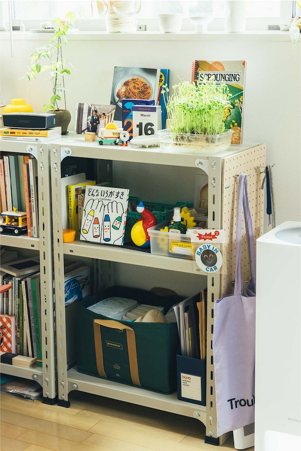 本棚は〈D&DEPARTMENT〉で購入した工業用のもの。「丈夫で無骨な雰囲気が気に入っています。奥行きがあるので雑貨を飾りやすいのもポイント。ここには夫婦それぞれの好きなものをごちゃまぜにディスプレイしています」。棚にはナツミさんの料理本や、夫・ボルオさんの植物に関する本などが並ぶ。