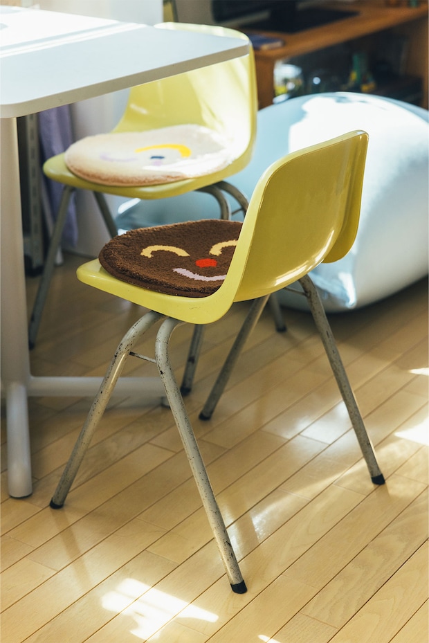 〈D&DEPARTMENT〉で見つけた、黄色のダイニングチェア。「もともと駅で使われていた古いものです。小田原愛美さんのスマイルラグを敷いて使っています」