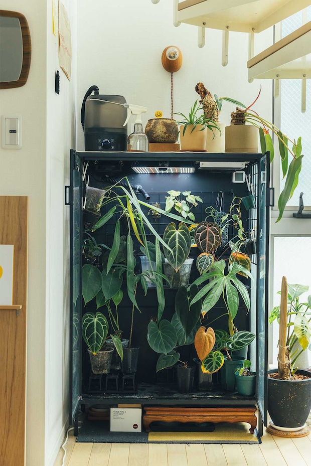 ボルオさんが熱中している熱帯植物たち。室内温室は〈IKEA〉のチェストを改造したもの。左上に開けた穴から爬虫類用加湿器のホースを通し、湿度は80%にキープ。「ライトは自然光に近いものを選んでいます。娘の面倒をみる合間に植物のお世話も楽しんでいます」(ボルオさん)