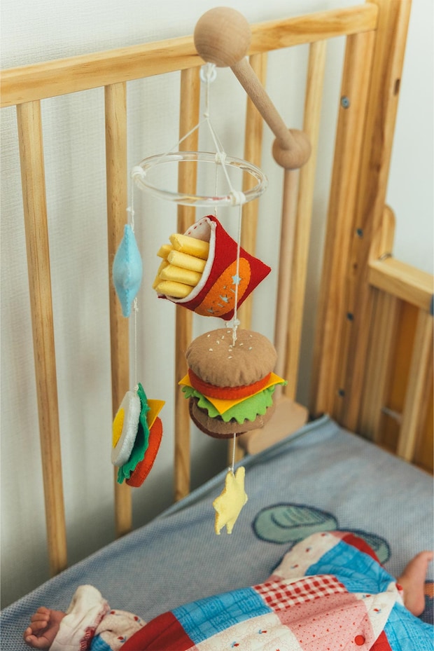 手づくりのフェルトモビール。「食べることが好きになってほしくて、ハンバーガーやポテトなどを吊るしてみました。ポテトには娘の名前もあしらっています」