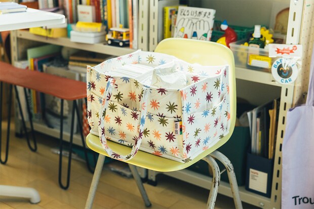 イギリスの〈MERRY + BRITE〉のオムツバッグ。「Instagramで発見したのですが、日本への配送をしていなくて。ダメ元でDMしたら送っていただけました!カラフルな星模様が可愛くてお気に入りです」