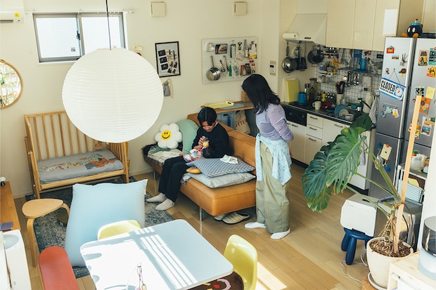 家族団らんのリビングスペース。ベビーベッドは〈大和屋〉の「そいねーるミニ」を〈ベビレンタ〉でレンタル。「夜は夫婦どちらかがリビングで娘の面倒をみるのですが、このベビーベッドはソファの真横につけられるので、安心して添い寝できます」