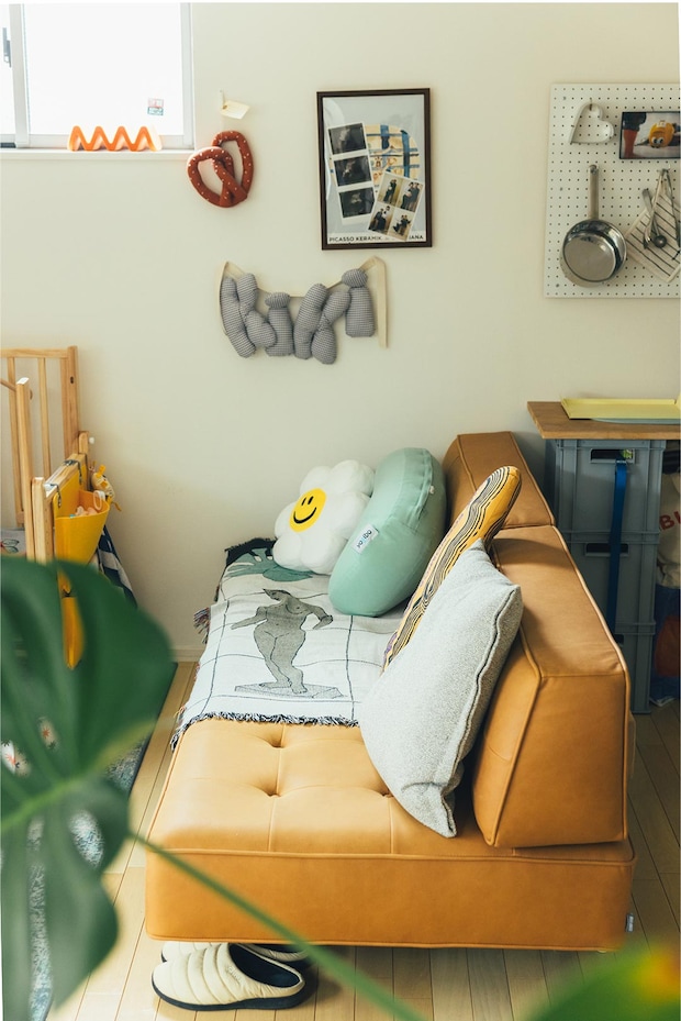 ソファは〈CRASH GATE〉で購入。背もたれは取り外し可能でベッドとしても使える。クッションは〈wiggle wiggle〉の花モチーフのものや〈Yogibo〉の授乳クッション、〈HAY〉などをミックス。壁には娘さんの名前をかたどったクッションや、南青山のインテリアショップ〈NICK WHITE〉でみつけた〈YUKI &DAUGHTERS〉のプレッツェルのぬいぐるみ、額に入れたマタニティフォトやエコー写真をディスプレイ。