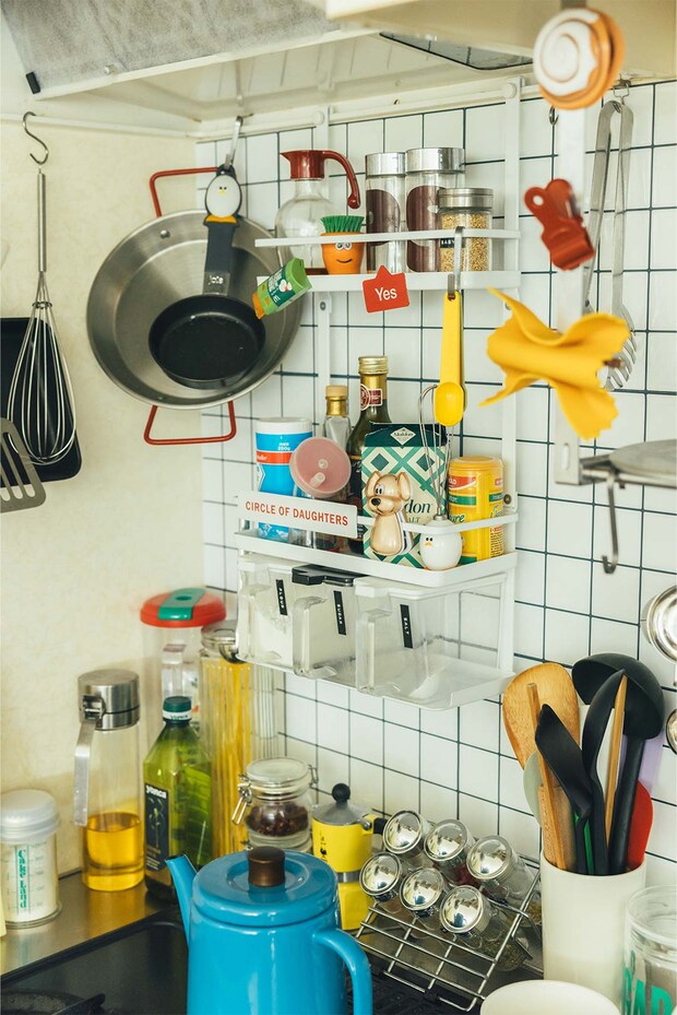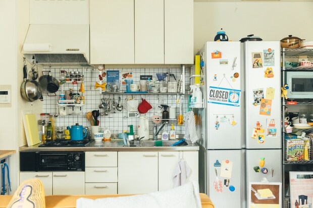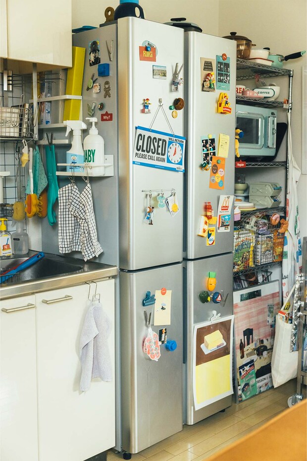 1日のなかで一番長い時間を過ごすというキッチン。「この家に住み始めた4年前から料理が好きになって、気づけばキッチン道具もたくさん増えました。なかでも食べ物モチーフの雑貨はついつい集めてしまいます」。キッチン台の壁にはAmazonで購入したタイル風シートを。「カフェやレストランの厨房みたいな雰囲気をイメージしています。フックでフライパンを吊るしたり、ステンレス用品を多く取り入れたのもポイント。ものが多いと掃除は大変ですが、そのついでに整理や配置を見直せるのはいいところです」。日々の暮らしのなかで好きな時間を聞くと、「朝ごはんをつくっているとき」と即答。「パンをつくったり、お菓子もよくつくりますよ」