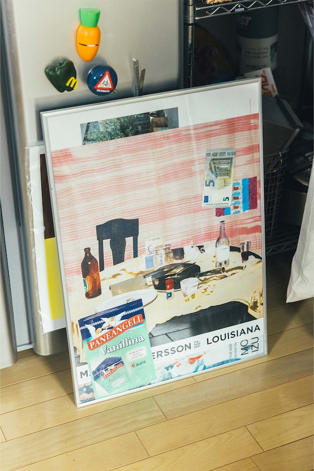 美術館で見つけた食卓のポスターをベースに、旅先の海外スーパーで買った砂糖のパッケージや余った紙幣、飴の包み紙などをコラージュ。「ポスターのサイズがフレームに合っていなかったので、いろいろ足してみました」