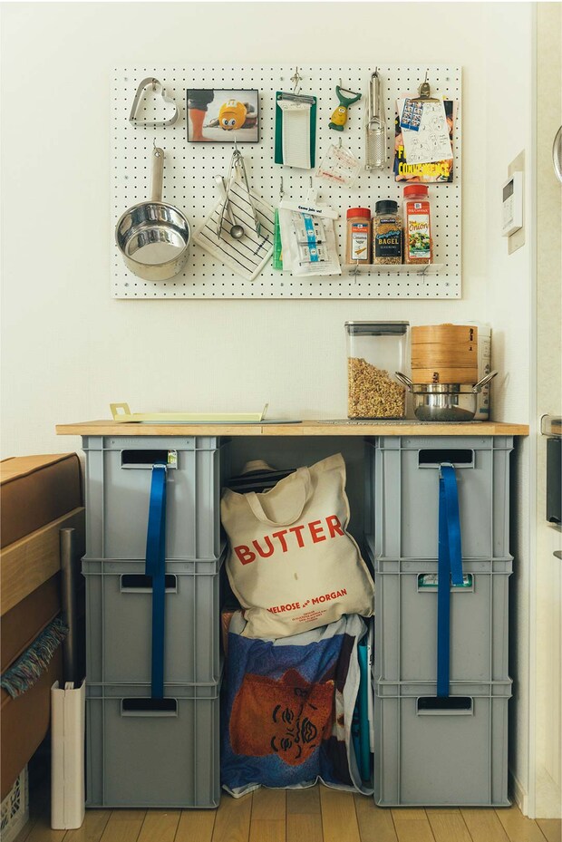〈PACIFIC FURNITURE SERVICE〉のコンテナを柱に、木の板を渡して自作した作業台兼収納棚。コンテナ内には飲み物のストックや非常食を保管。壁の有孔ボードはホームセンターで購入し、賃貸でも取り付けられる留め具で設置。調理器具のほか、〈M&M’S®〉の写真や韓国の〈ARTIST BAKERY〉のポストカード、〈D&DEPARTMENT〉で見つけた伝票バインダーなど、食にまつわる雑貨もディスプレイ。