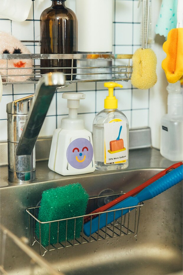 パッケージデザインが気になる洗剤やハンドソープは、お気に入りのステッカーを貼ってデコる。左が小田原愛美さんのスマイルステッカー、右はアートブックフェアで見つけたもの。