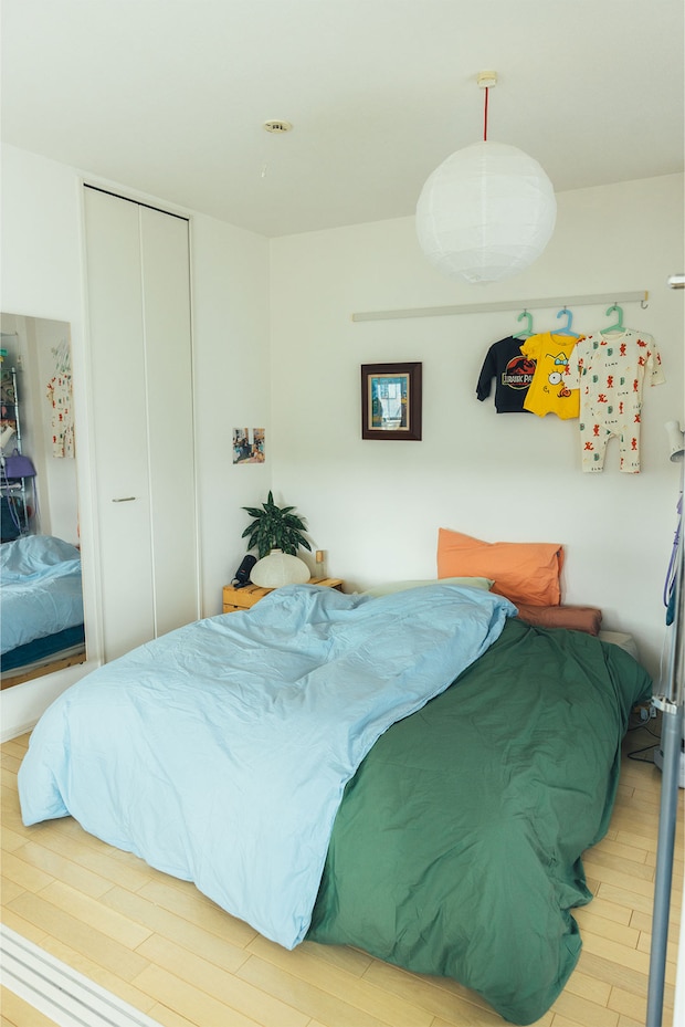 カラフルなベッドリネンで気分の上がる寝室。リネンは韓国のブランド〈mix&match〉のもの。額に飾られた絵は〈HYST〉で見つけた名もなき一枚。お気に入りだけどまだ着られない娘さんの服は、レールにかけてディスプレイ。