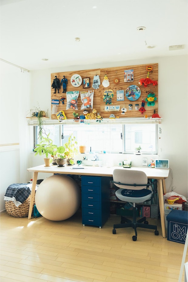 螺旋階段を上がった先に広がる夫婦のワークスペース。ワークデスクは奥行きがあって作業しやすい〈IKEA〉のダイニングテーブルをチョイス。真ん中には同じく〈IKEA〉のワゴンを置いてエリアを分割。ワークチェアは〈ITOKI〉のもので、「色使いが可愛いのと、長時間作業していても腰が痛くならない機能性も気に入っています」。バランスボールは娘さんをあやすときの必需品。壁の上部には有孔ボードを取り付けて、お気に入りの雑貨たちをディスプレイ。「オモチャ系は実際に見て買うことがほとんどです。横浜で開催される『ジャンクショー』や、高円寺や原宿のお店によく行きます」