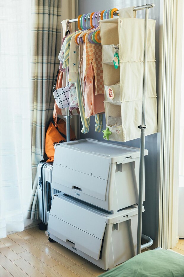 娘さんの収納スペース。カラフルなハンガーは〈IKEA〉。隣にかけている麻素材の小物ホルダーは〈無印良品〉。「シンプルだったのでバッチなどでデコってみました」。下の〈THOR.〉のスタッキングコンテナにはタオルやバッグなどを収納。