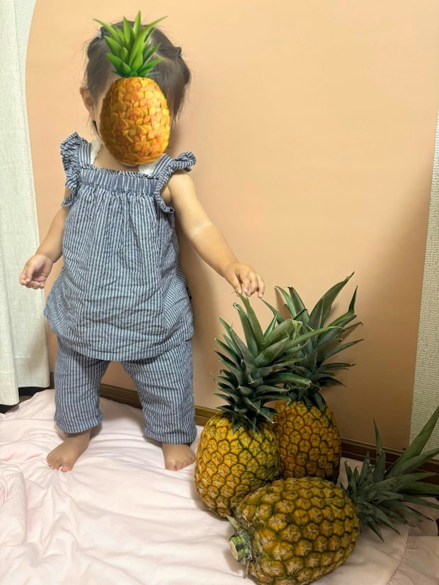 みてねにパイナップルを美味しそうに食べる娘の写真を載せる