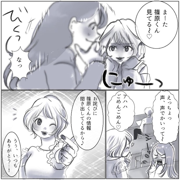 そんな消極的な彼女をサポートしてくれているのが、同級生のリカだ。彼女は社交的でみんなと仲が良いため、よくエミの代わりに篠原くんに話しかけては、色々と情報を聞き出してくれていた。ただ、自分よりも仲が深まっていく2人を見て、焦り出すエミ。