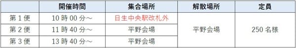 開催時間、集合場所、解散場所、定員は上記を予定している。なお、会場内混雑緩和のため、第1便目は「日生中央駅」が集合場所となっている。また、各回定員に達し次第終了となる。