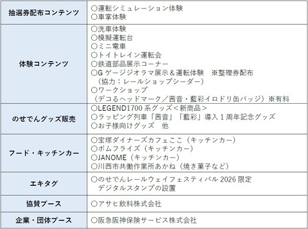 そのほか、抽選券配布コンテンツとして「運転シミュレーション体験」「車掌体験」、体験コンテンツとして「洗車体験」「模擬運転台」「ミ二電車」「トイトレイン運転会」「鉄道部品展示コーナー」「Gゲージジオラマ展示&運転体験」(整理券配布)、「ワークショップ デコるヘッドマーク/茜音・藍彩イロドリ缶バッジ)」(有料)が予定されている。