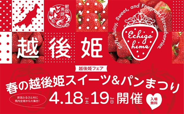 新潟県は、旬を迎えたブランドいちご「越後姫」の魅力を発信するイベント「越後姫フェア ~春の越後姫スイーツ&パンまつり~」を4月18日(土)と19日(日)の2日間、新潟ふるさと村で開催する。入場は無料だ。