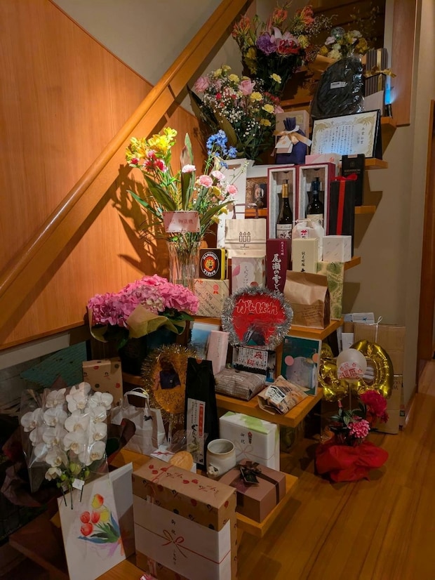 投稿に添えられた写真には、38年間の教員生活を終えたお父様を祝う、圧倒的な量の贈り物が階段いっぱいに並べられています。多種多様な花束、観葉植物、ワインボトル、ギフトボックス、お菓子、そして心のこもった手作りのメッセージボードやバルーン。これら一つ一つが、お父様がどれほど生徒や同僚から慕われていたかの、何よりの証拠です。