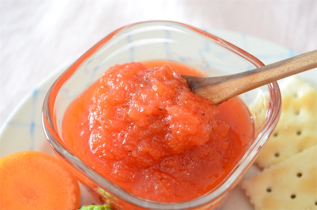 見た目は普通のいちごジャムですが、すくってみるとすりおろしたにんじんの主張あり。果物と野菜の組み合わせが、どんな味になっているのかワクワク♪