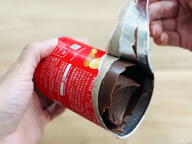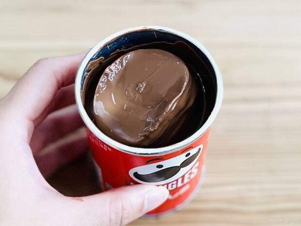 プリングルズを開封し、筒の中に溶かしたチョコレートをそそぎます。ポテトチップスと筒の隙間を埋めるようにチョコをそそぎましょう。