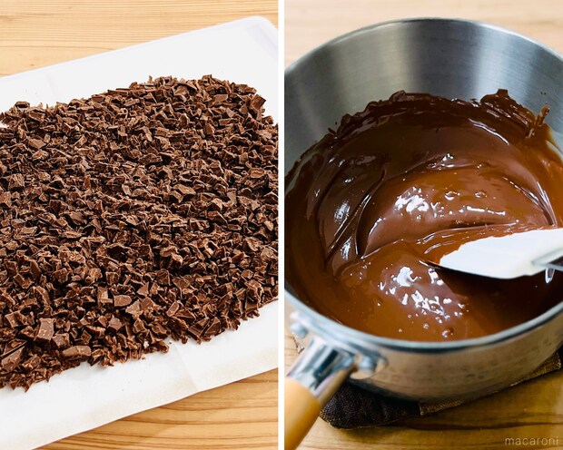 まずは板チョコレートを細かく刻み、湯煎で溶かします。詳しい湯煎方法はこちら▼