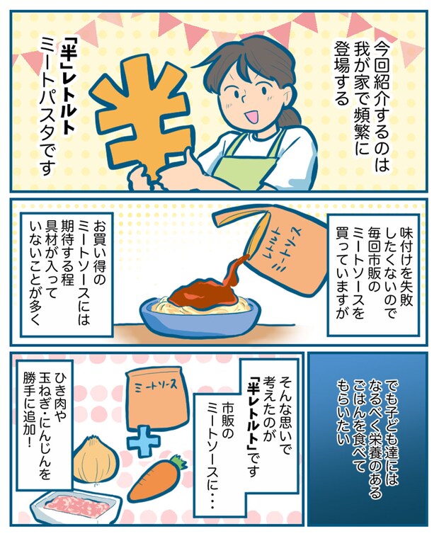 『育児』×『料理』をテーマに、野菜嫌いな長女ちゃんが奇跡的に食べたメニューや、子どもと一緒につくった料理など、チッチママさんのおいしくて愛情たっぷりの食にまつわるストーリーを連載します。思わず食べたくなるおいしそうな料理のイラストにも注目。第59回目は、市販のレトルトミートソースをレベルアップさせる「半」レトルト技をご紹介! 味付けに失敗せず、栄養も取れるのでお昼ご飯にもピッタリ! ぜひ参考にしてみて。
