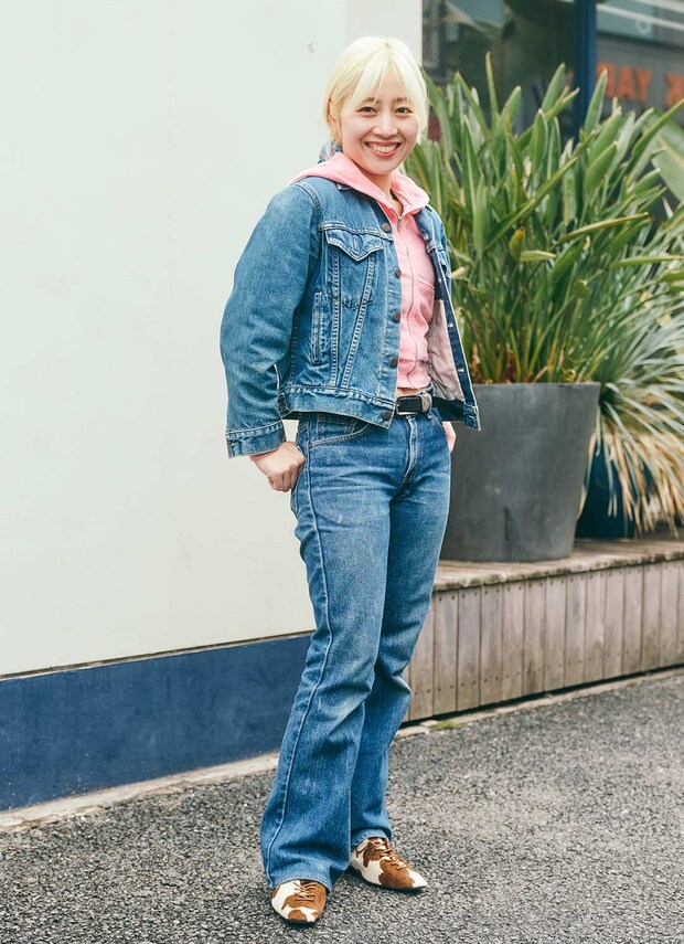 『リーバイス』のジャケットとパンツを合わせた、こなれ感たっぷりのデニムONデニム。『ロサンゼルスアパレル』のピンクのパーカーを挿し色に、足元はリュクスなムードを添えるハラコのアニマルプリントで、エッジの効いたスタイルに。カジュアルなデニムに映える華やかなピンクがコーデのアクセント。