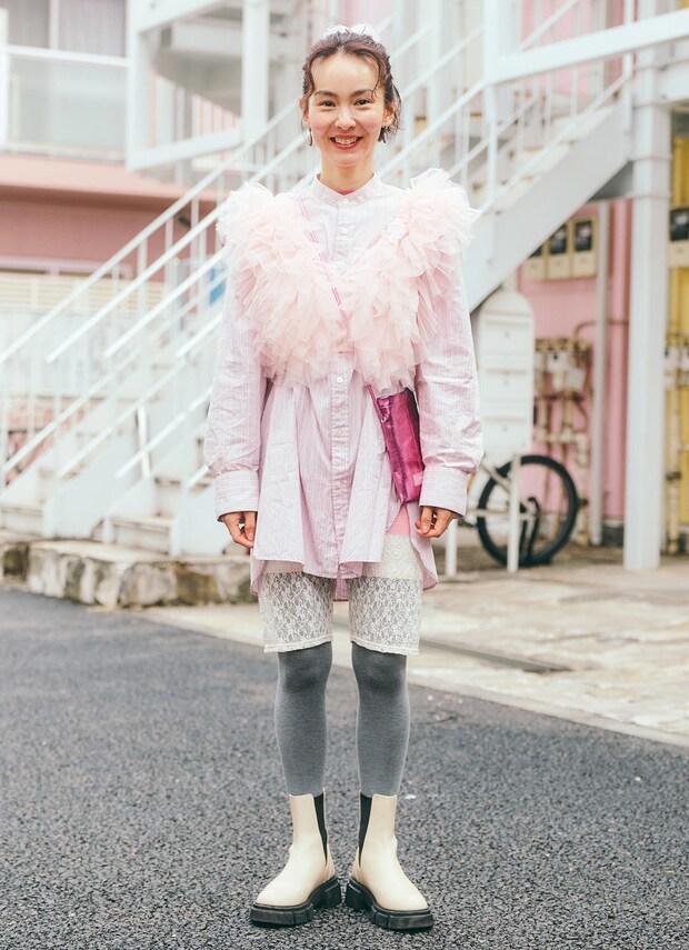 淡いピンクのストライプシャツに、ピンクのチュールジレを重ねたmanamiさん。ボトムは、白レースボトムとグレーのタイツをレイヤード。レースやチュールなど、異素材を重ねることで、コーデ全体に奥行きと立体感が生まれ、のっぺり見えを解消。ハッピーオーラを放つチャーミングな装いが印象的。