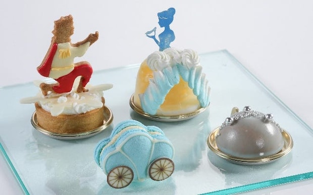 スタンドに並ぶのは、ブルーやホワイトを基調にした華やかなスイーツ。上段には、グレープフルーツゼリーを使用した印象的な「シンデレラのドレスゼリー」、王子様がガラスの靴を渡すシーンを表現した「王子様サブレとピスタチオのタルト」など目にも美しいスイーツが並ぶ。ティアラやかぼちゃの馬車を思わせる世界感たっぷりのアフタヌーンティーは、まさにフォトジェニック。