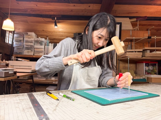 糸を通すための穴を開けは綺麗なノートづくりの大事な工程なので慎重に・・・。