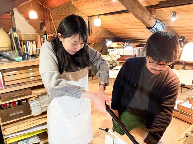 ノートの裁断は力作業。切り口を綺麗に仕上げたいのでつい力が入ります。店主が丁寧にサポートしてくださいます。