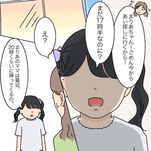 私はまりあちゃんに心配をかけないよう「まりあちゃん!ごめん、今からあいを探しに行くから!」とできるだけ明るく伝えました。ずっと待っていてくれたまりあちゃんには申し訳ないけれど、すぐにあいを探しに行きたいのでまりあちゃんには帰ってもらわなければいけません。すると、まりあちゃんは「まだ17時半なのに?」と被せ気味に強い口調で言ったのです。「え?」と戸惑う私に「まりあのママは最近、20時くらいに帰ってくるの」と話し始めるまりあちゃん。