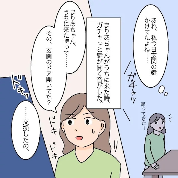 あれ?私、今日玄関の鍵かけてたよね・・?さっきまりあちゃんがうちに来た時、ガチャッと玄関の鍵が開く音で気づいたことを思い出した私。どうしてまりあちゃんが鍵を開けられたの・・?「まりあちゃん、うちに来た時って・・その、玄関のドア開いてた?」と恐る恐る聞いてみると、まりあちゃんは少しの沈黙のあと「・・交換したの」とぼそりと言いました。「交換」という言葉にドキッとした私ですが、その意味をすぐには理解できませんでした。