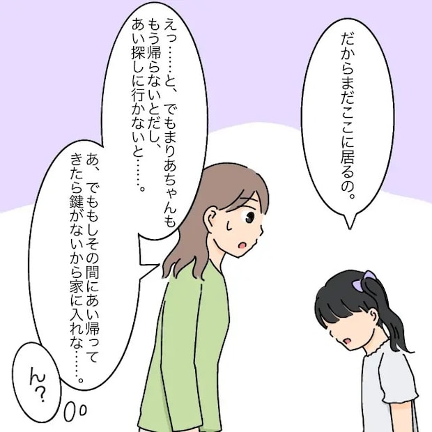 そして、「だからまだここに居るの」と言って帰ろうとしないまりあちゃん。困った私は「えっ・・と、でもまりあちゃんももう帰らないとだし、あい探しに行かないと・・」と説得しつつ、「あ、でももしその間にあい帰ってきたら鍵がないから家に入れな・・」と独り言を言っていて「ん?」と自分の言葉に引っ掛かりました。