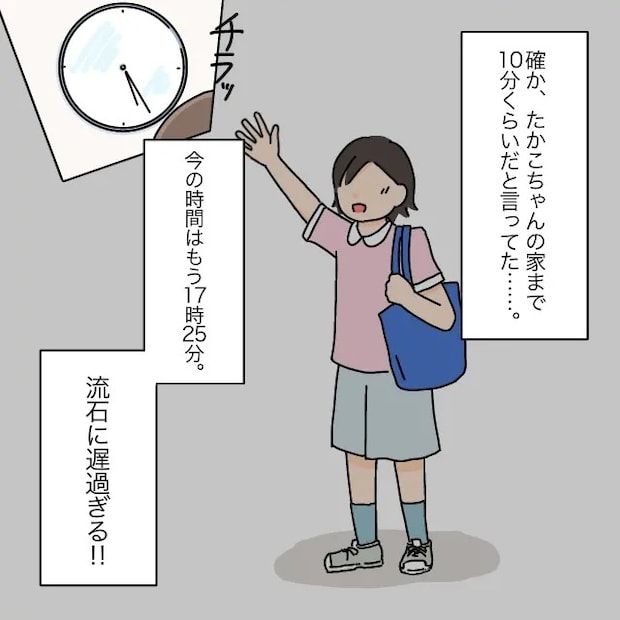 確か、たかこちゃんの家までは歩いて10分くらいだとあいが言っていました。今の時間はもう17時25分。あいがたかこちゃんの家を出てからもう50分くらい経っています。さすがに遅すぎます!!まさか途中で事故にでも遭ったんじゃ・・とつい悪い想像をしてしまいます。