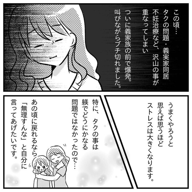 タクくんの子育てだけでなく、義実家との同居や不妊治療の問題もあり、もっつんさんのストレスはふくらみ続けました。