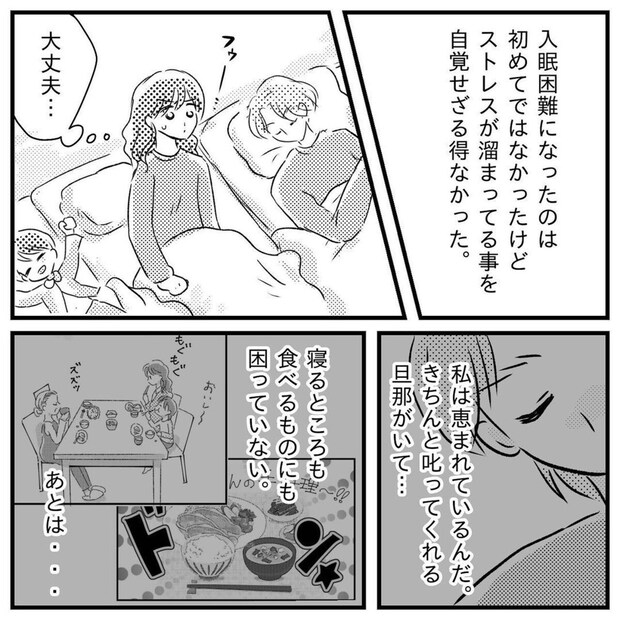 息子の学校でのトラブル、義実家との同居、夫の叱り方。モヤモヤが膨らみ、もっつんさんは寝つきが悪くなる程ストレスを溜めていました。