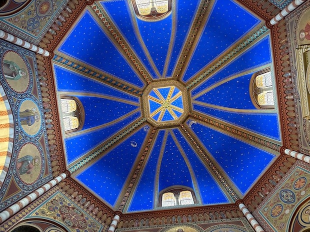 教会装飾、赤レンガとブルー、白とゴールドの色の組み合わせが本当にお洒落で、まるで宮殿のような高貴さを感じる教会です。