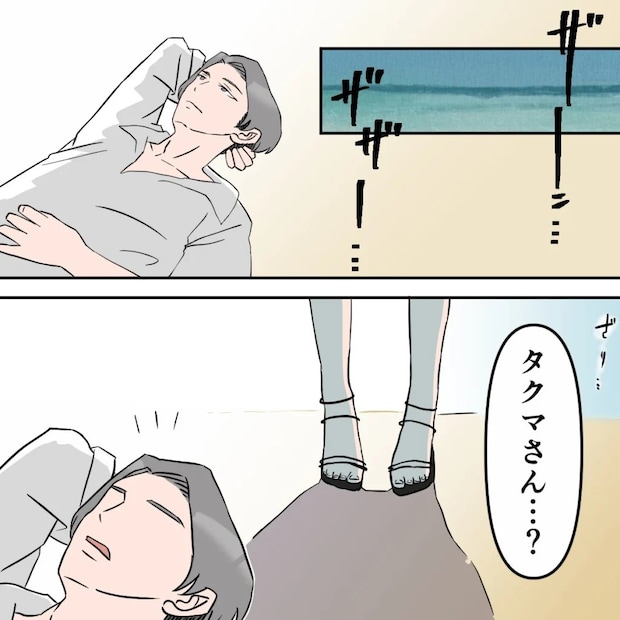 「タクマさん・・?」部屋から飛び出して行ったタクマさんを追うと、海辺で寝そべっている姿を見つけ声をかけました。