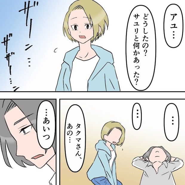 「アユ・・」私に気づいたタクマさんに、「どうしたの?サユリと何かあった?」心配になってそう聞いてもタクマさんは何も答えてくれません。「タクマさん、あの・・」ともう一度声をかけると、「・・あいつ」とタクマさんがポツリ。