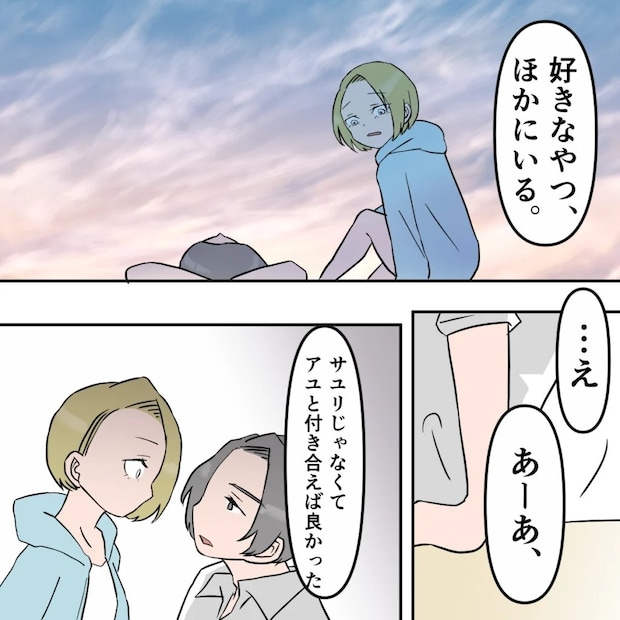 そして「好きなやつ、ほかにいる」と言いました。「・・え」と驚く私に、「あーあ、サユリじゃなくてアユと付き合えば良かった」と私の目を見て言うタクマさん。